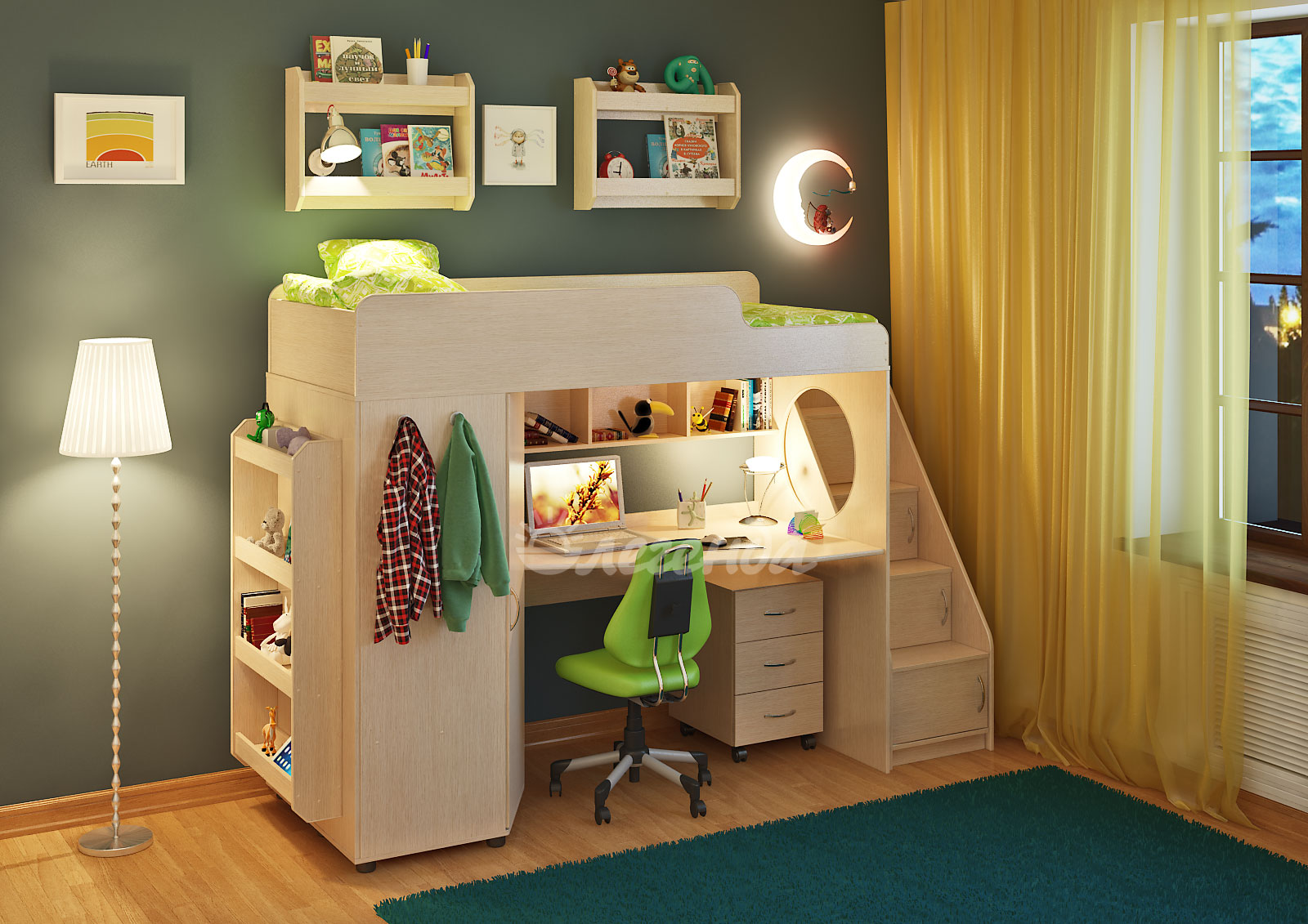 Кровати-чердаки Легенда-4 (Сказка-4) можно купить в цветах корпуса Венге Светлый или Ольха, они отлично подойдут для уютной детской комнаты девочек и мальчиков.