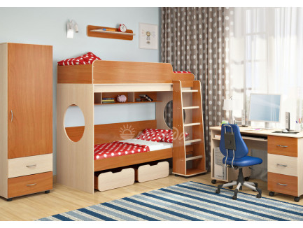 Детская мебель Легенда. Комната №7: двухъярусная кровать Легенда-7, лестница ЛП-04, пенал Л-01, полка Л-01, Стол Л-01.